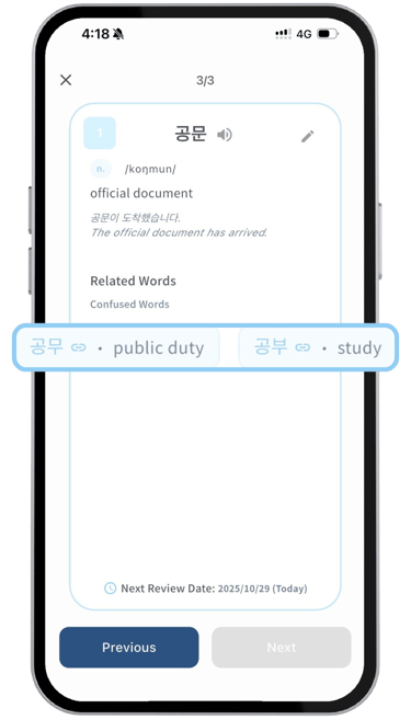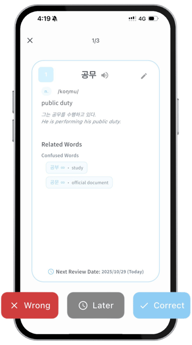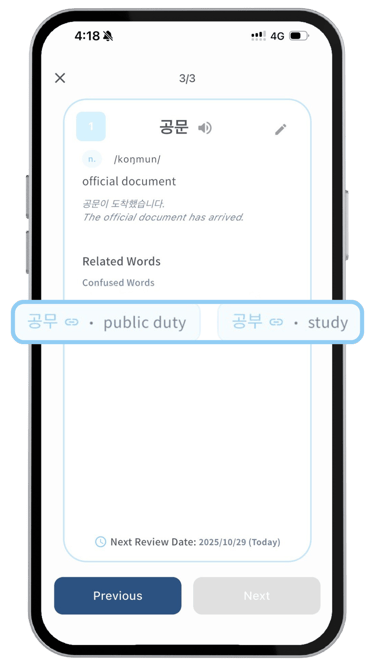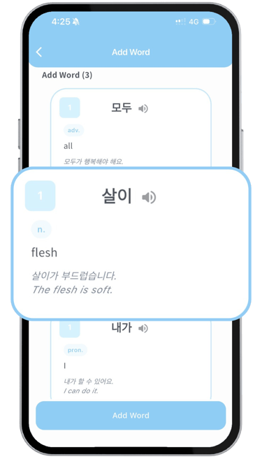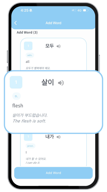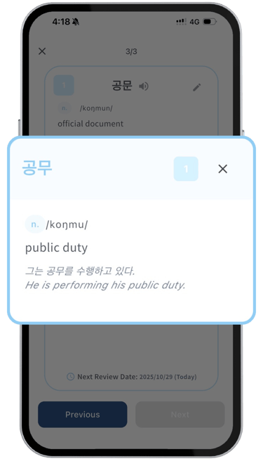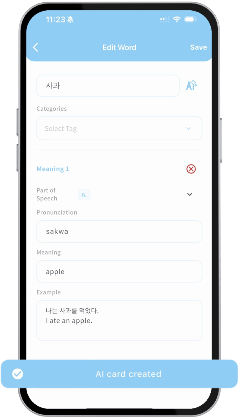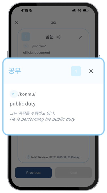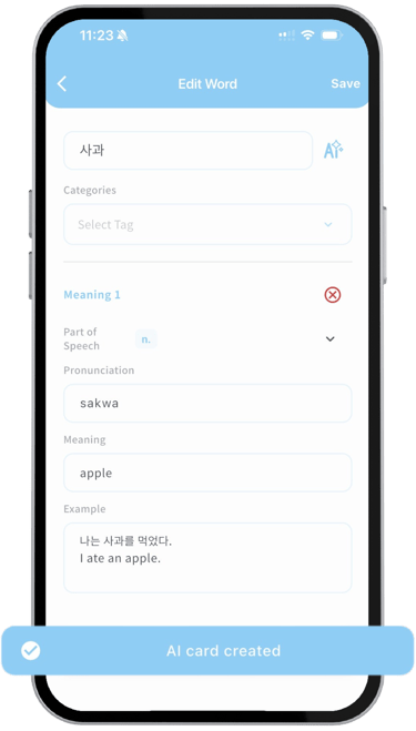 Part of speech, pronunciation, and example sentence — all done in one tap.